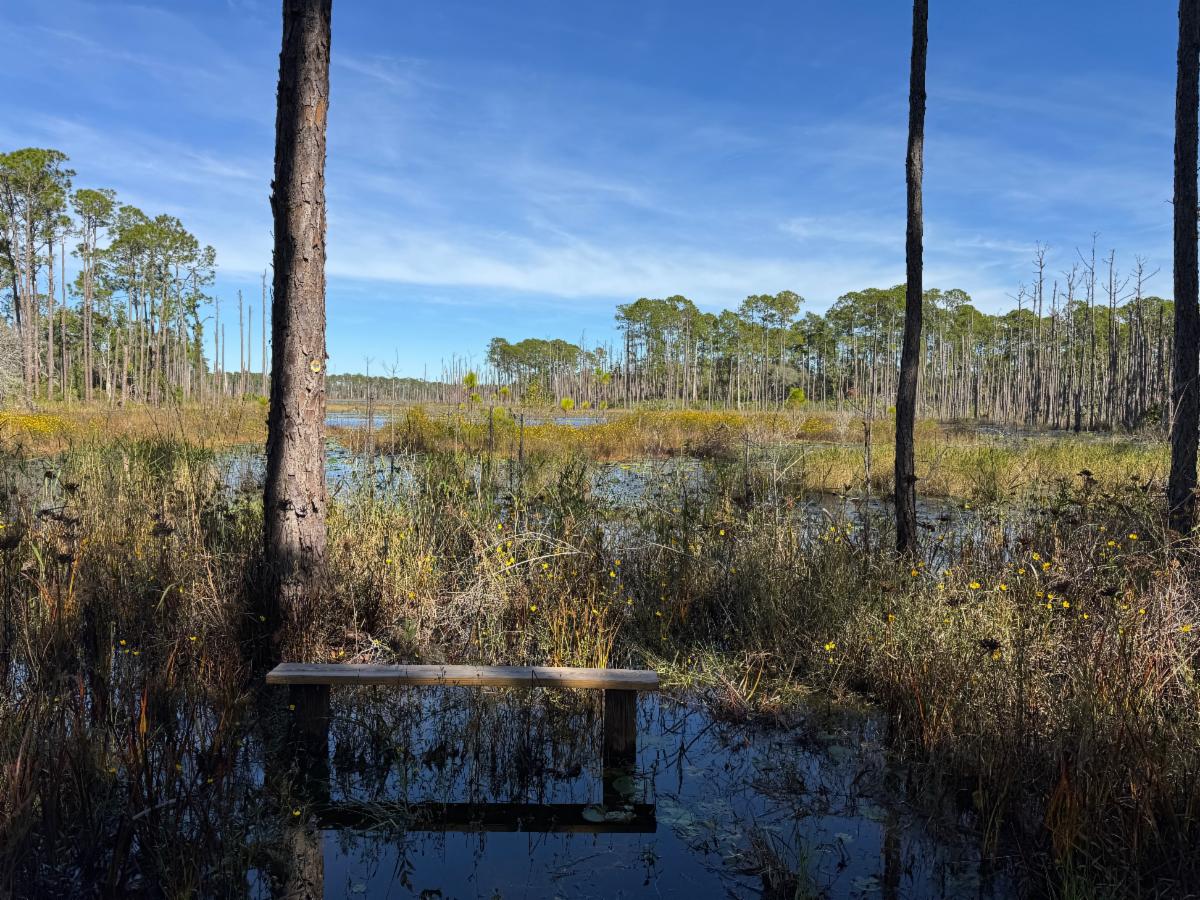 the convenience of wide multi-use trails with grassy hiking surfaces that are surprisingly comfortable for trails shared with horses. There is almost no sugar sand, and the sturdy paths are easy on the ankles and legs. And of course, there’s the beauty of the landscape. This is pine flatwoods heaven, a tranquil sea of tall pines, palmetto, and occasional groves of cypress and live oak. You’re also miles from suburbs that might otherwise whitewash the stars at night or drown out the calls of the wildlife. Colt Creek teems with deer, turkey, and hawks, and owls serenaded me throughout my time in my tent at Tired Tree. Fall is also a colorful time to visit, as blooms of sunflowers, blazing stars, and chaffheads lined the sides of the trail, and