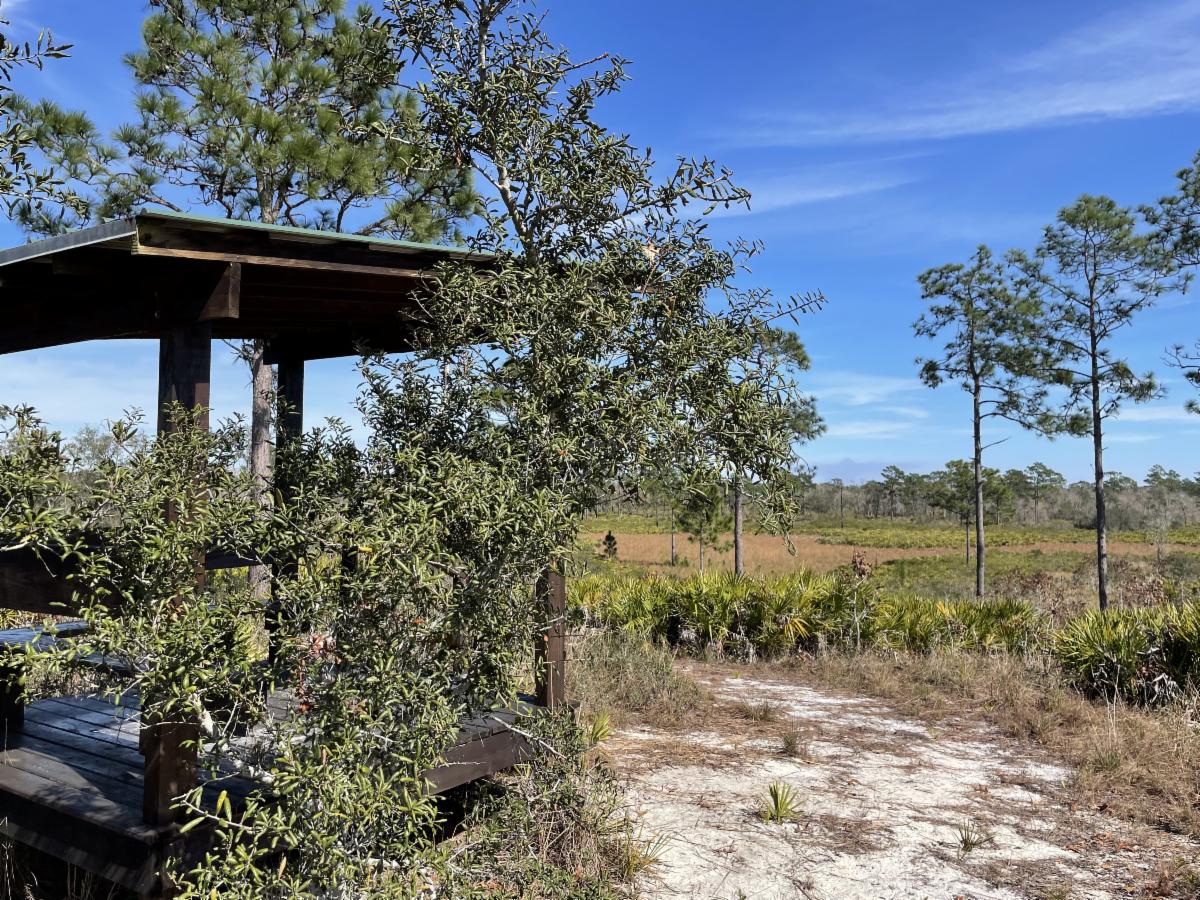 Another highlight of Tiger Creek Preserve are the rest stops. Well-maintained benches can be found at perfect locations throughout the Preserve, including at overlooks of the Tiger Creek on the Creeks Bluff Loop. Perhaps the best is Tricia’s Peak, a covered shelter on the Highlands Loop with two large benches atop one of the highest scrub ridges in the Preserve with panoramic views of the grassy swale and prairie below. This is bar-none my favorite place to have lunch in Florida.