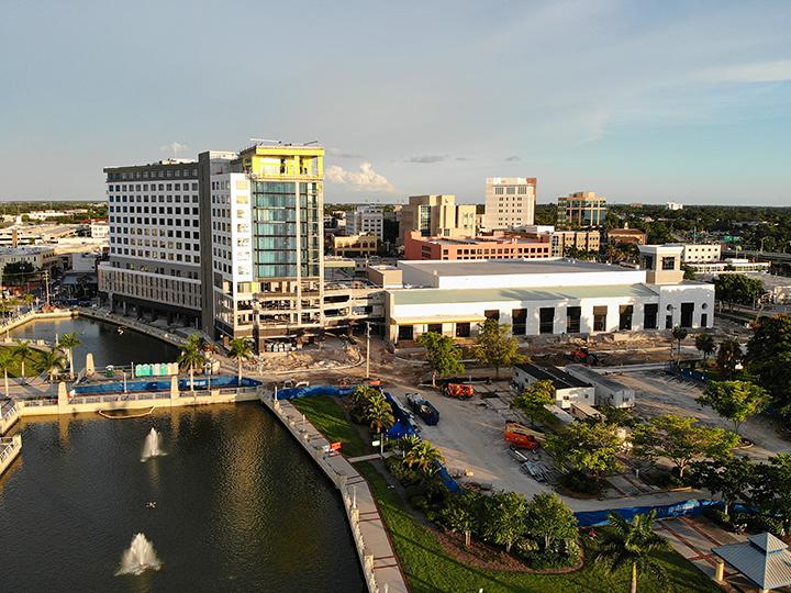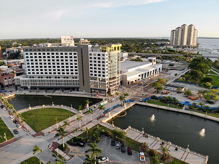 View from the East: The Luminary Hotel & Caloosa Sound Convention Center border the River Basin.