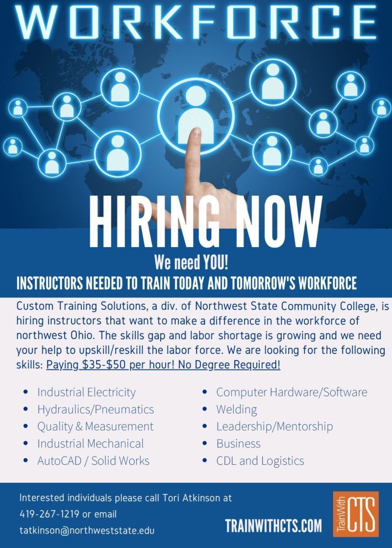 Our training partner, CTS & Northwest State are looking for full & part time instructors. No degree required.