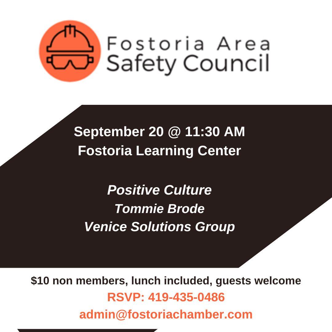 All Safety Council meetings begin at 11:30 a.m. and are held at the Fostoria Learning Center. RSVP via email: Admin@FostoriaChamber.com