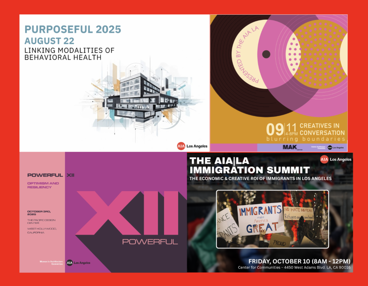 This fall, AIA|LA is bringing you four powerhouse conferences—each designed to spark ideas, expand networks, and drive real change. Purposeful zeroes in on the future of healthcare in architecture, flipping the script by connecting architects directly with healthcare clients through dynamic, hands-on charrettes. Creatives in Conversation invites bold voices across disciplines for an unfiltered exchange on culture, creativity, and design. Powerful takes the stage once again to celebrate leadership, equity, and the unstoppable force of women in architecture. And the Immigration Summit will tackle the pressing issues of immigration and its impact on our profession, our city, and our future.