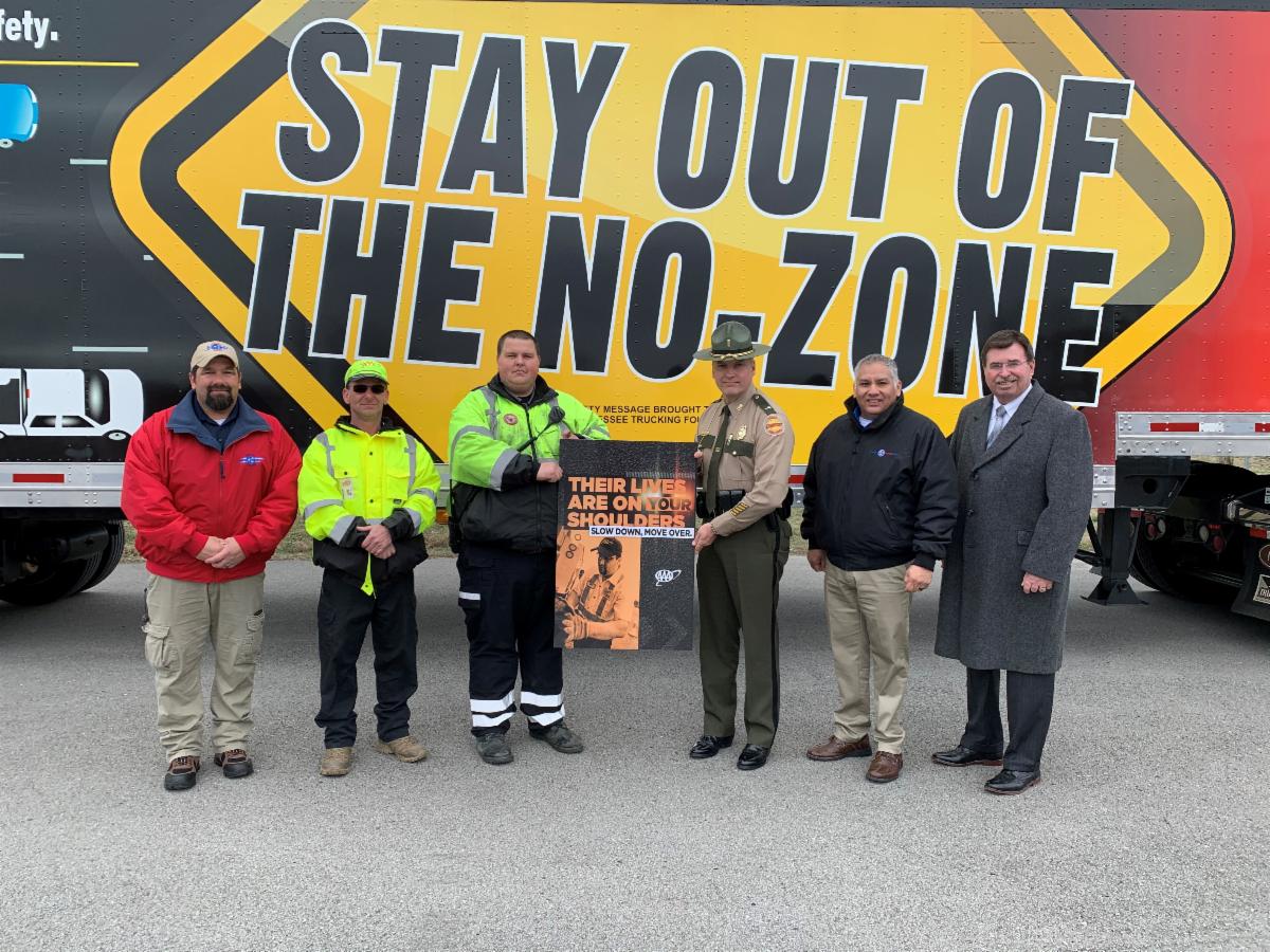 Tennessee Road Team Captains participated in the AAA Move Over, Slow Down press conference at the THP training center on Thursday, January 23. Pictured in front of TTA No Zone trailer (L to R), TN Road Team Captain David Brady - Old Dominion Freight Line, TDOT Help truck operators, Lt. Bill Miller - THP and THSO Director Buddy Lewis.