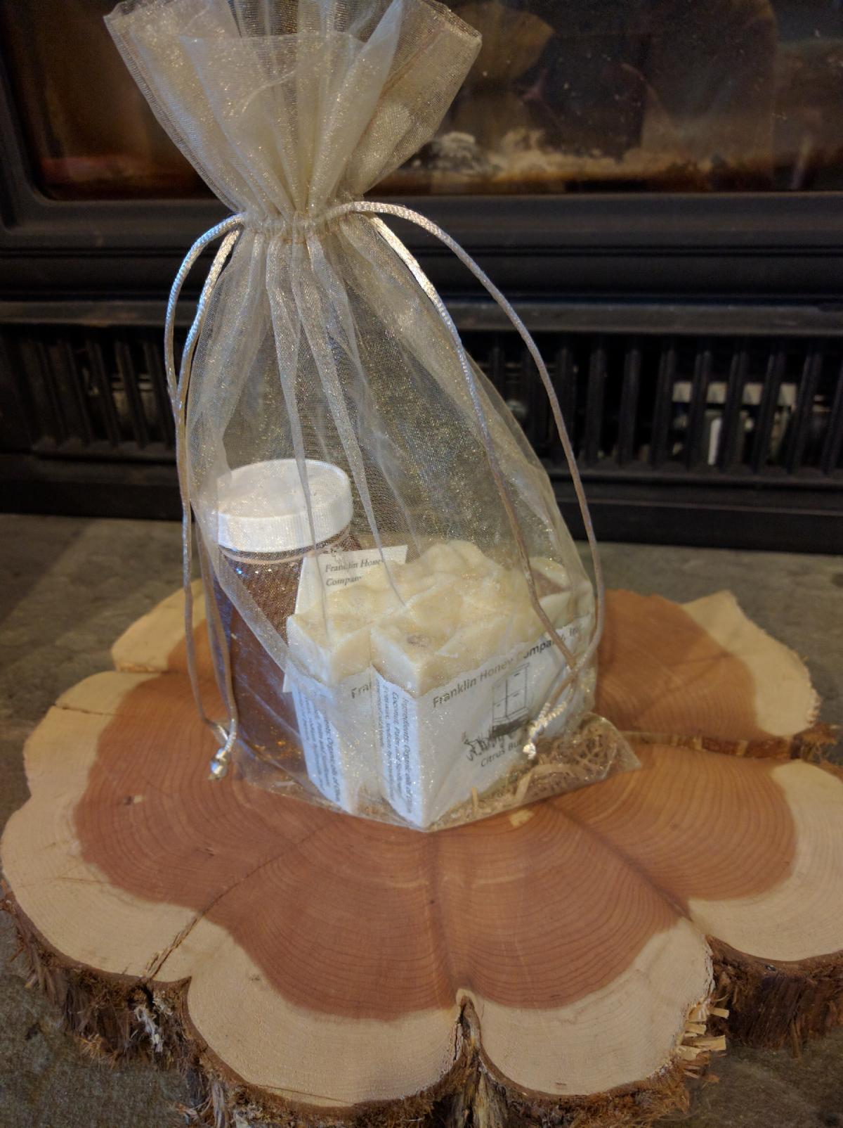 The Franklin Honey Company offers a “Create your Own Gift Bag” with 8 oz of raw, local honey and two handcrafted soaps for $22. Visit the Franklin Honey Company website for more information.