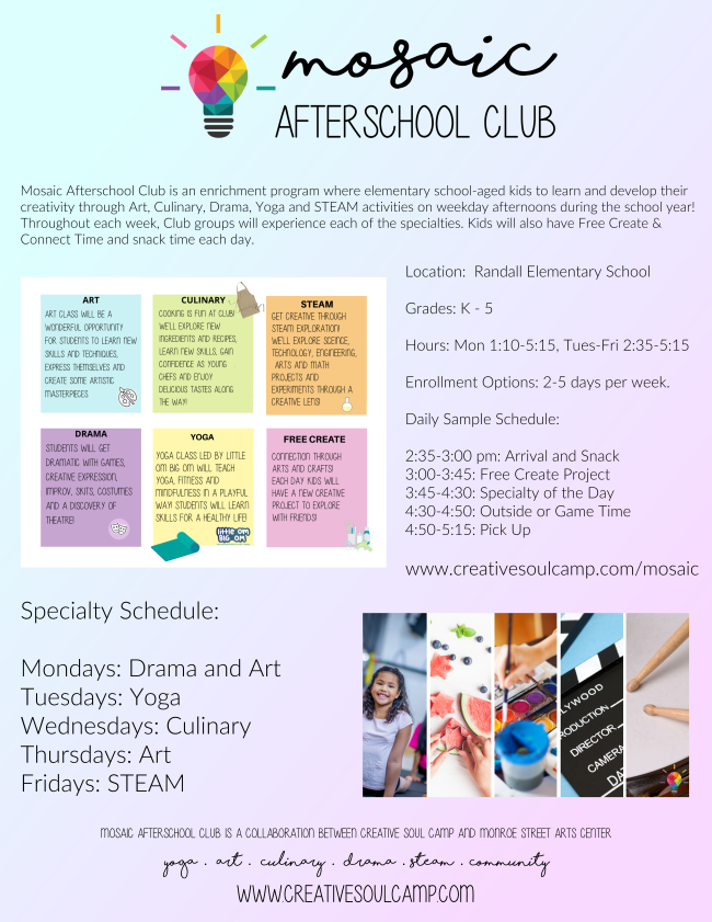Mosaic Afterschool Club will again be offered next school year! Mosaic will take place right at Randall Elementary School for the 2026-2027 school year. Registration for new families opens Thursday, February 19th at 9:00 am. Mosaic Afterschool Club is a unique creative arts enrichment program that offers art, yoga, culinary, STEAM and drama programming in the after school hours throughout the school year. Families choose 2, 3, 4 or 5 days per week. Each day kids enjoy snack time, free create art activities, a specialty of the day and outside/game time. Mosaic Afterschool Club is a collaboration between Creative Soul Camp and Monroe Street Arts Center. For more information and registration, visit www.creative soul camp.com/mosaic