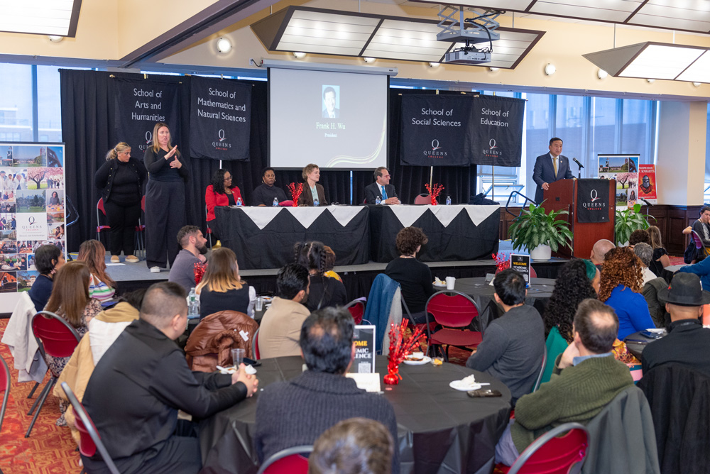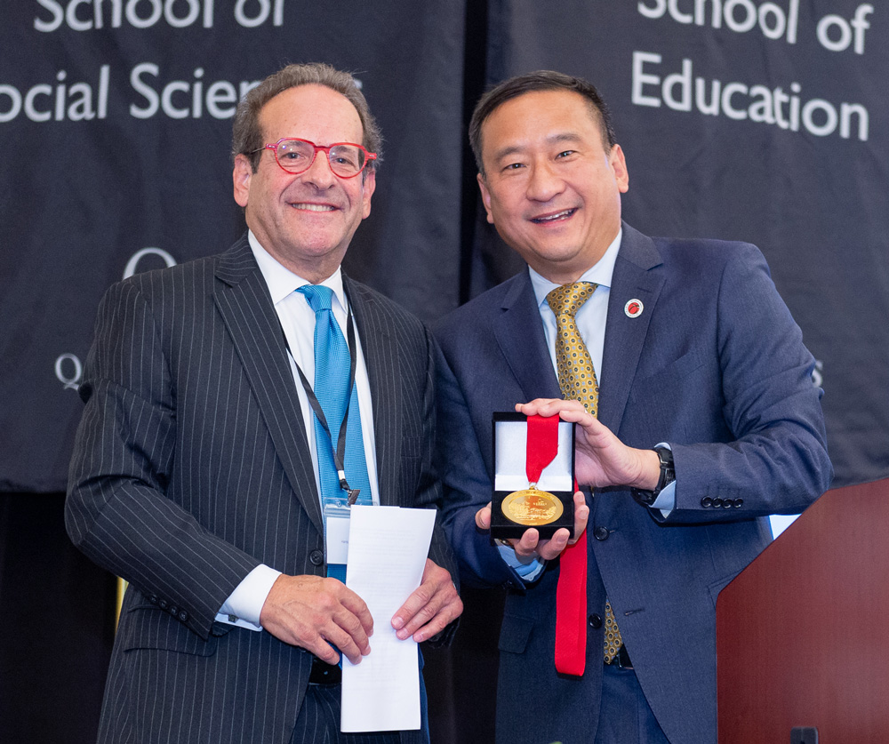 | | Christie Chung, executive director of the Mills Institute, and yours truly in conversation | | On the morning of Tuesday, October 28, I cast my election ballot on campus, taking advantage of the fact that QC serves as an early polling place. Today—Tuesday, November 4—is Election Day. If you haven’t already voted, I urge you to do so; polls are open until 9 pm. Not sure where to go? Enter your street address here. | | Outstanding students were honored at QC’s annual Academic Excellence Award Ceremony on the evening of October 28. More than 2,400 students earned distinctions as Dean’s List Scholars, Provost Scholars, and Presidential Scholars during the last academic year. Queens College Foundation Member Harris M. Horowitz ’78, formerly managing director-global head of tax and tax policy and innovation leader at BlackRock Inc.—the world’s largest asset manager—gave a memorable keynote. “I still believe that college, and even further education, is critically important and more than worthwhile,” he assured the audience. | During the ceremony, I had the pleasure of presenting the President’s Medal to Harris M. Horowitz ’78. | Special thanks to Taruna D. Sadhoo (Honors and Scholarships/Macaulay Honors College) and colleagues, who worked closely with my office to provide an evening of celebration and recognition for deserving high academic achievers. We are most grateful to the faculty and staff who help guide and mentor students throughout the academic year. | The next day, the latest installment of the Mathematical Discoveries Series—an annual program launched in 2022—featured Lauren K. Williams, a researcher from Harvard University and the Radcliffe Institute and one of this year’s recipients of a MacArthur Foundation fellowship, aka “the genius grant.” I’m delighted that Queens College students have opportunities to hear presentations by world-class scholars. | From left: Scott Wilson (Mathematics), Daniel Weinstein (School of Mathematics and Natural Sciences), Lauren K. Williams, Christopher Hanusa (Mathematics) | | |