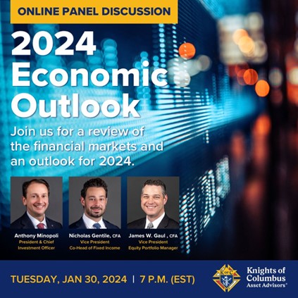 You are invited to an online panel discussion with Anthony Minopoli, President and Chief Investment Officer of Knights of Columbus Asset Advisors; Nicholas Gentile, CFA, Vice President, Co-Head of Fixed Income; and James W. Gaul, CFA, Vice President, Equity Portfolio Manager. They will review what transpired in the financial markets during 2023 and provide an outlook for 2024.