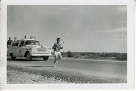 Carlos Mohamed of Circle No. 660 runs along the Laredo-Monterrey highway near Sabinas as a Red Cross truck follows, December 1960. (Knights of Columbus Multimedia Archives) | |