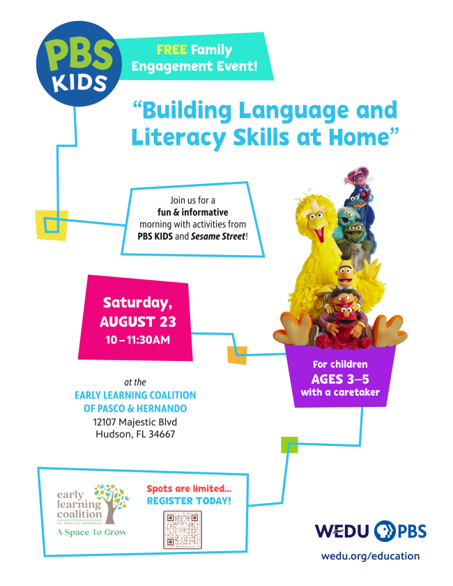 Join us on Saturday, August 23, 2025, for a fun and informative morning hosted by the Early Learning Coalition and WEDU/PBS. Enjoy engaging activities from PBS KIDS and Sesame Street, designed to support your child's learning and development.