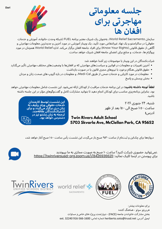 با توجه به تغییرات جدید و گسترده در پالیسیهای مهاجرتی ایالات متحده که بر جامعه افغان تأثیر میگذارد، ورلد ریلیف سکرامنتو وبینارهای منظم اطلاعرسانی را به زبانهای دری و پشتو برگزار میکند.