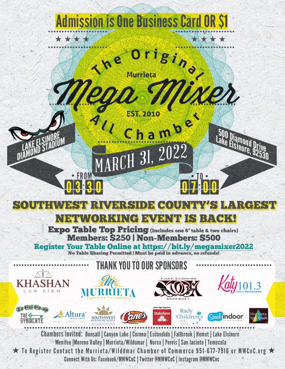The All-Chamber Mega Mixer has been rescheduled to March 31. Menifee Valley Chamber Members can reserve a booth and create new connections in the region.