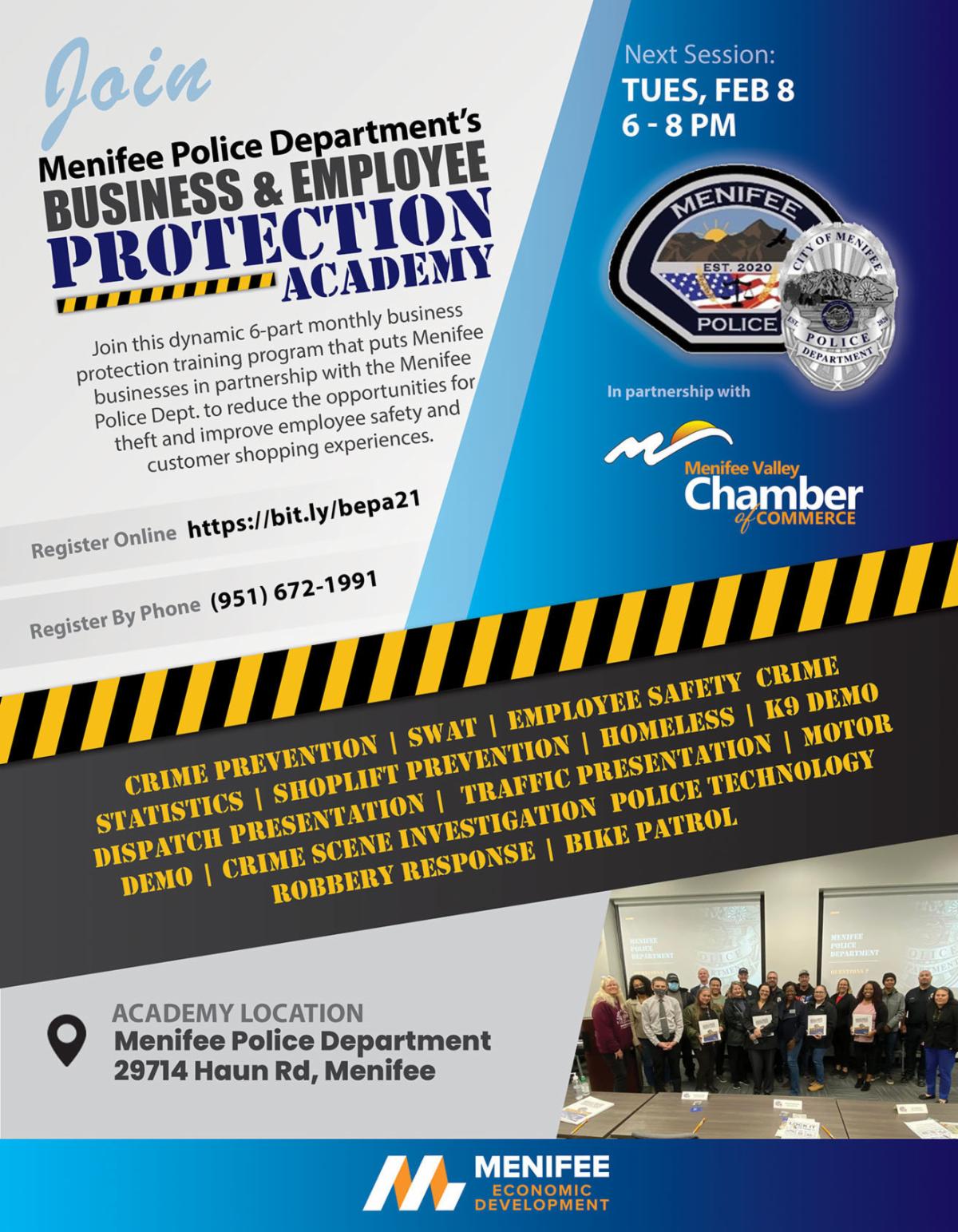 Session 2 of the 6-part Menifee PD Business & Employee Protection Academy will take place on Tuesday, February 8, at 6:00 PM.