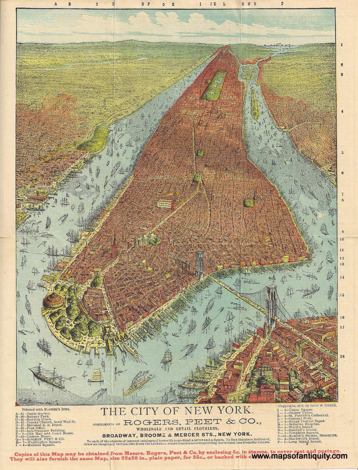Both of these handsome bird's-eye view maps were published for tourists visiting the area and were given out as folding pamphlets. Note how crammed full of ships the waters around Manhattan are!