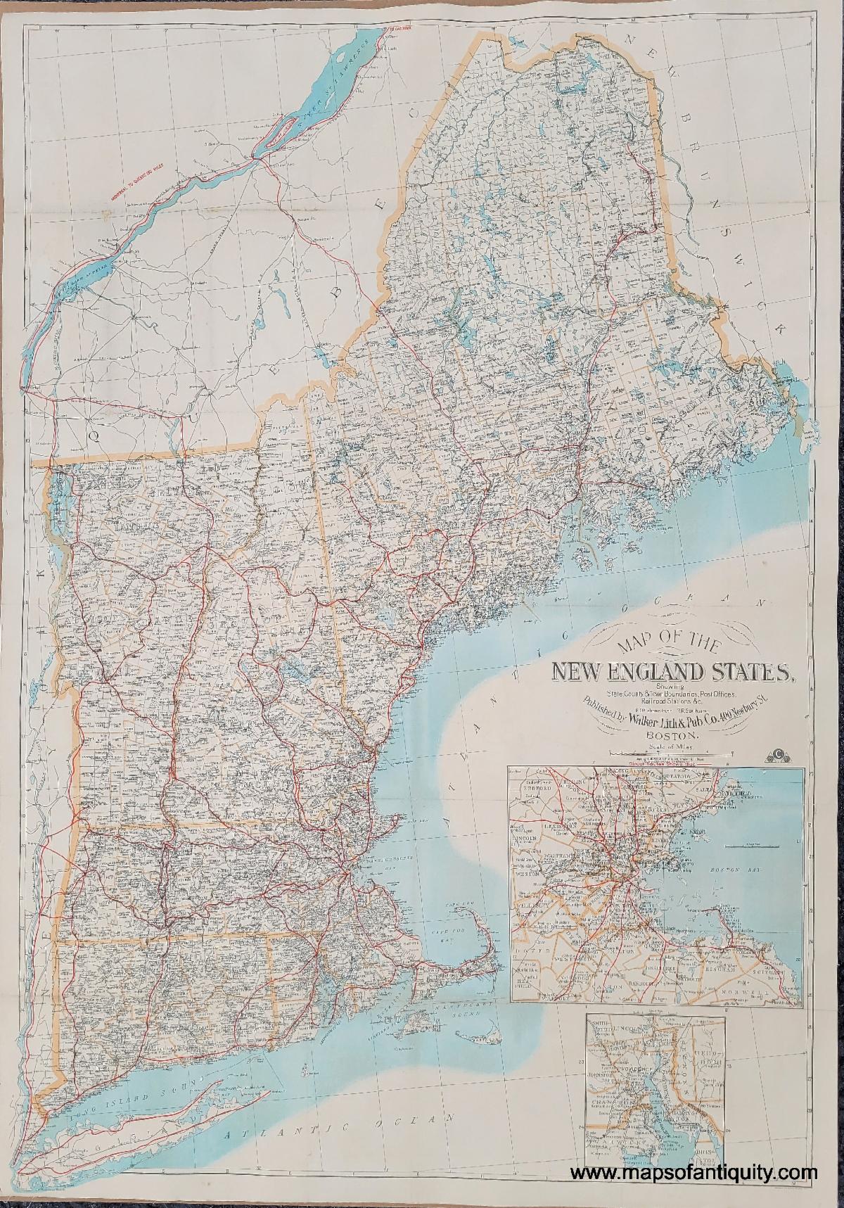 1909 - Map of the New England States showing State, County & Town Boundaries, Post Offices, Railroad Stations &c. - Antique Map