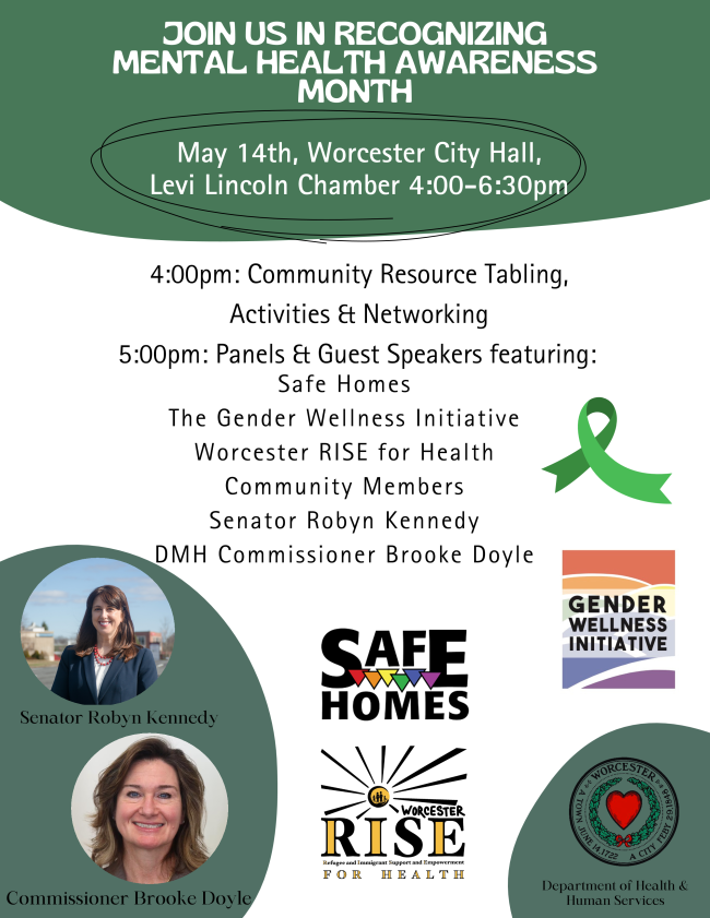 This event is in recognition of Mental Health Awareness Month, and will feature community resource tables, activities, networking, panelists and guest speakers including community members with lived experience, DMH Commissioner Brooke Doyle, Senator Robyn Kennedy, Safe Homes, the Gender Wellness Initiative, and Worcester RISE for Health.