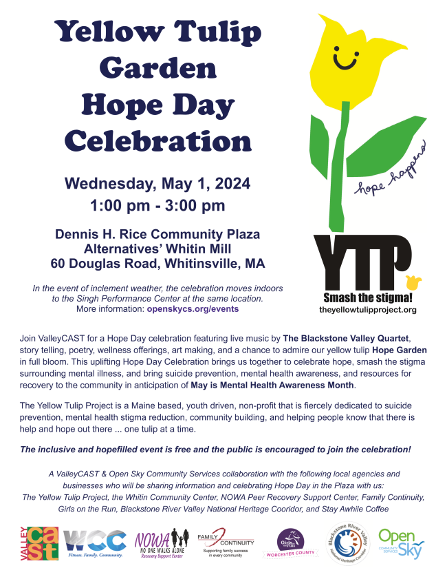 ValleyCAST's Hope Day Celebration will take place on Wednesday, May 1 from 1:00 - 3:00 PM at Alternatives' Whitin Mill on the Dennis H. Rice Community Plaza.