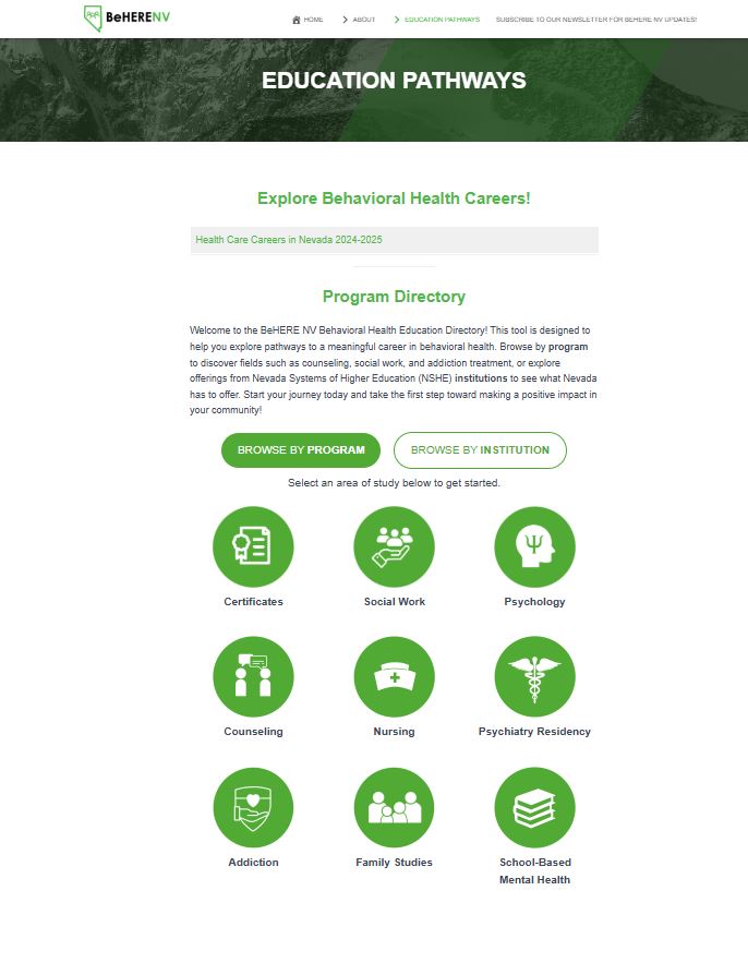 | | BeHERE New Behavioral Health Pathways Webpage Update | | Our Behavioral Health Pathways section on the BeHERE webpage has been completely renovated! Our amazing graduate assistant, Yuhan Bi, did a fantastic job transforming the section into a fun and interactive experience for those exploring potential career paths in behavioral health. This powerful tool is designed to help you explore meaningful careers in the field. Whether you choose to browse by program or explore institution options through the Nevada Systems of Higher Education (NSHE), we've created this space just for you. The updated Behavioral Health Pathways section also includes the Health Care Careers in Nevada 2024-2025 report, published by the Nevada Health Workforce Research Center at the University of Nevada, Reno School of Medicine, which provides insights into healthcare job opportunities in Nevada. | | NHSC Loan Repayment Program | | |