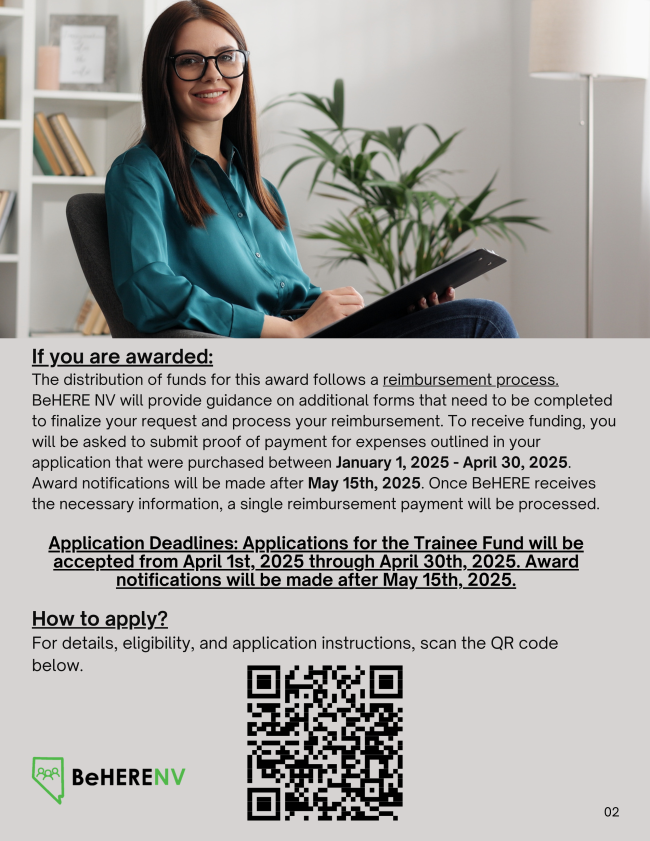 Applications are now being accepted to offset the costs (up to $1,000) of licensure/certification exam preparation materials, exam registration fees, and/or Nevada licensing/certification board fees. The application period for the Trainee Fund will be open from April 1, 2025, through April 30, 2025. Award notifications will be made after May 15, 2025.