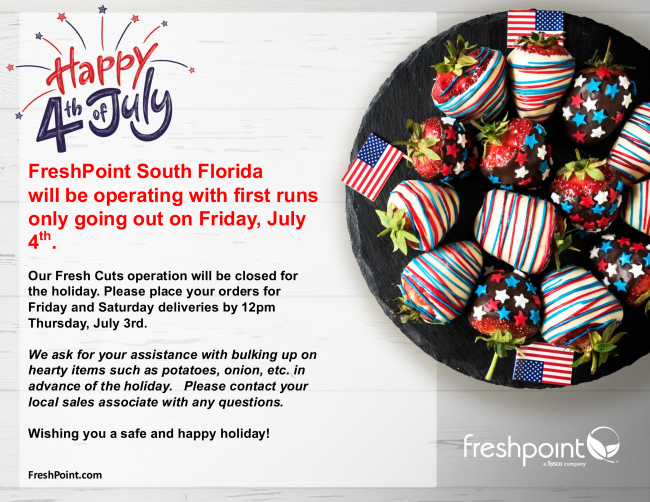Our Fresh Cuts operation will be closed for the holiday. For Friday & Saturday Fresh Cut deliveries, please place your order by 12pm on Thursday, July 3rd.