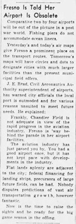 | However, early the following year, the War Department shifted plans. The facilities at Chandler Field were deemed inadequate, and a new location east of Fresno was chosen instead. Civil Aeronautics Authority Superintendent of Airports J.E. Read bluntly stated, “Fresno is way behind the parade in her airport facilities. The aviation industry has just passed you by. You had a good airport once, but it has not kept pace with developments in the industry.” Purchased by the Fresno City Council and leased to the U.S. Army, the new base officially opened on April 3, 1941, though months of construction still lay ahead. Men began arriving that May, and by November, the base was fully staffed. In January 1942, it was officially named Hammer Field in honor of Lieutenant Earl M. Hammer, the first Californian killed in action in the Army Air Forces during World War I. With the arrival of the Army Air Corps, the base quickly took on the character of a small town, complete with a church, fire department, library, and movie theater. Neat rows of small houses were built for officers, while enlisted men lived in barracks. The Post Exchange (PX) included a post office and general store and offered laundry and barbering services. The base newspaper, The Night Hawk, kept everyone informed and connected. | | | | |