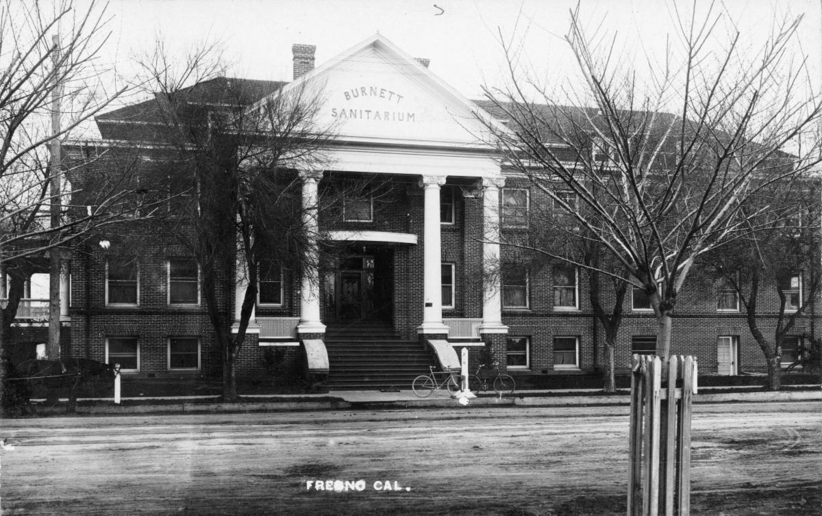 The Burnett Sanitarium, founded in 1897 through a partnership between local physicians and Mrs. Celia Burnett, marked a defining moment in Fresno’s early medical history. Originally located at the corner of Fresno and S Streets, the institution began as a modest private hospital and quickly earned a reputation for its quality of care. In 1905, a new building opened on the site, and by 1916, the addition of a five-story Burnett Annex positioned the sanitarium among the most modern hospitals on the West Coast with a capacity for up to 120 patients. Following its sale in 1945 to a nonprofit corporation, the facility was renamed the Fresno Community Hospital, later evolving through several name changes into what is now known as Community Regional Medical Center. A surviving postcard from the 1910s depicts the impressive early structure, a lasting image of the institution that provided care to Fresno.