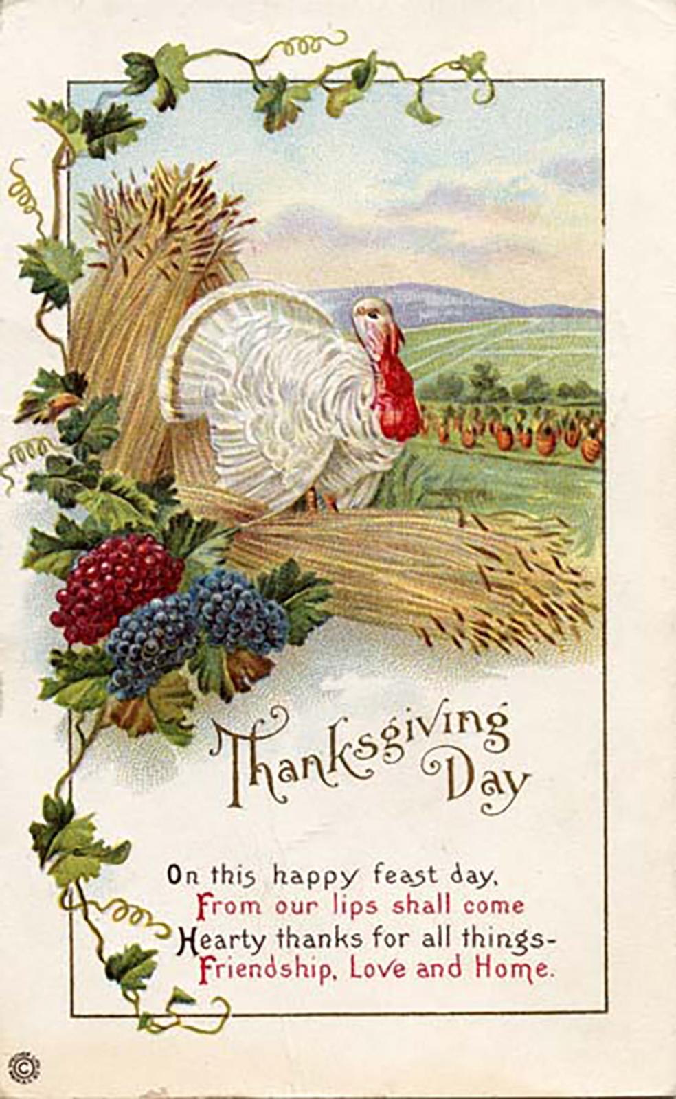 “Just how it came about that the turkey stumbled into national fame and found himself an object, if not of adoration, of at least wholesale digestion, is one of the unsolved mysteries. Perhaps, like Topsy, he "jest growed" into general favor for this special occasion. However, it may have happened that he, like Lord Byron, awoke one morning and found himself famous, is presumably of less interest to countless thousands of gobblers who strutted around the barnyard with great pomp and circumstance three or four days ago, than it is to them to-day. If they cannot strut and gobble in the closing scene of their brief earthly triumphs, they assuredly look far n more pleasing to the eye of man when placed upon the festal board, beautifully roasted and hedged about with a generous supply of cranberry sauce, and so it happens that even the turkey joins in the general thanksgiving. The nation has much for which to be thankful.