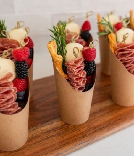 When it comes to appetizers on a wooden board or stone slab, either eaten straight from the board itself or portioned into these cute little cups, we recommend Rioja, Amarone, and Burgundy.