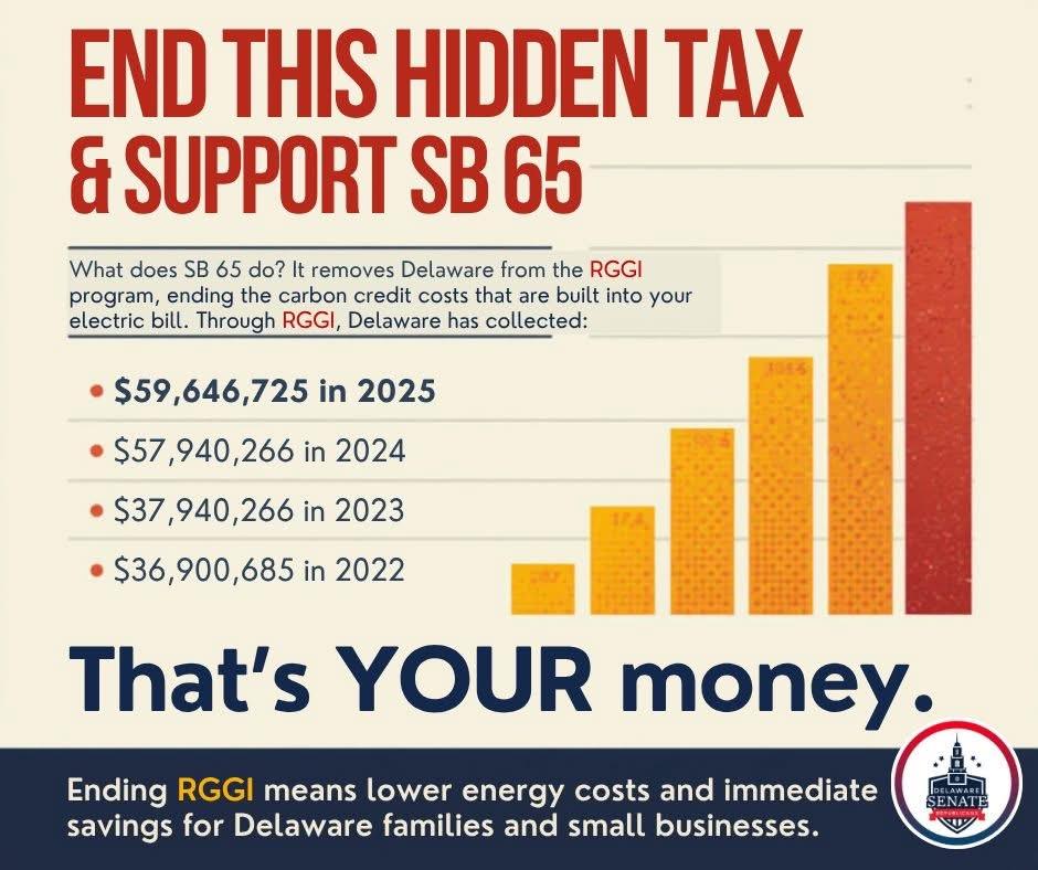 SB 65 removes Delaware from the Regional Greenhouse Gas Initiative program, ending the carbon credit costs that are built into your electric bill.
