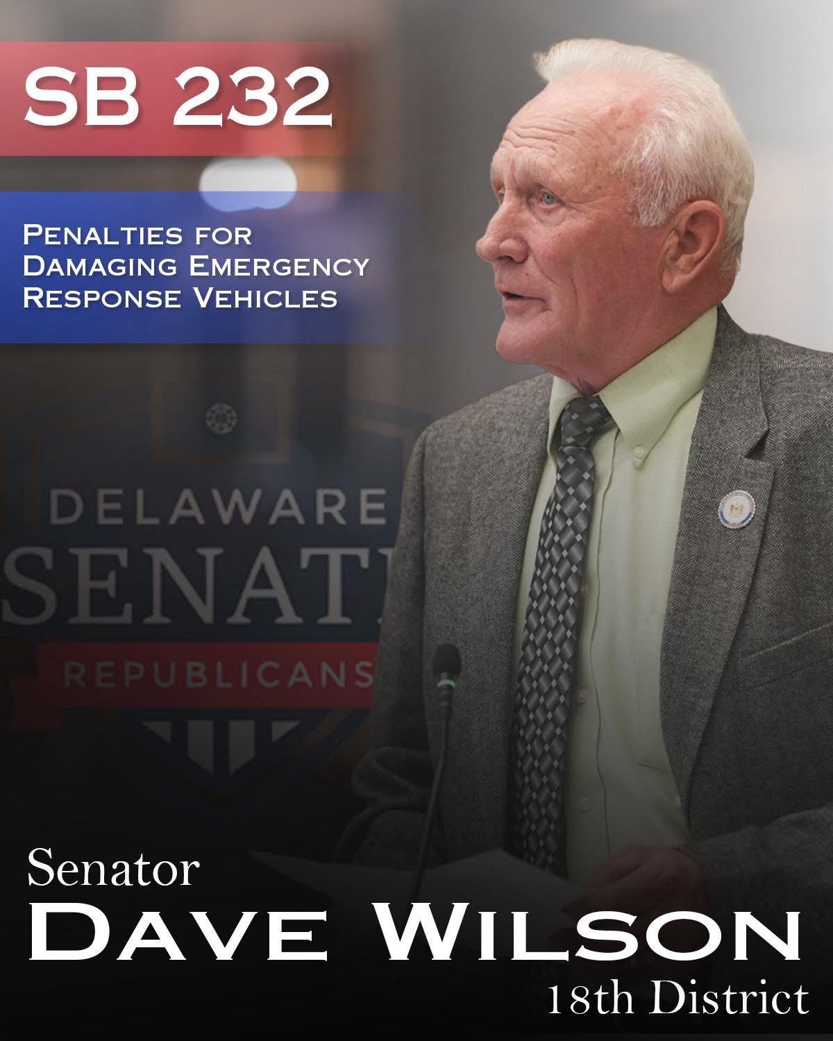 DOVER, DE — Legislation sponsored by Senator Dave Wilson (R-Lincoln) to strengthen penalties for damaging emergency response vehicles has cleared the Delaware State Senate and now heads to the House for consideration.
