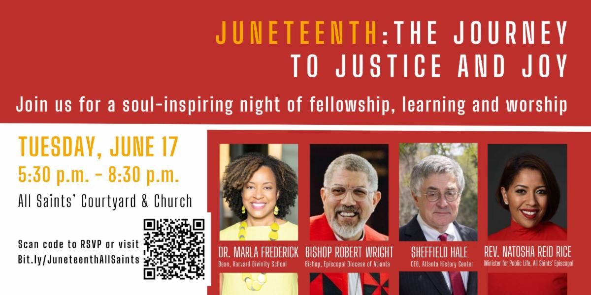 As we honor the legacy of Juneteenth, which marks the end of enslavement in the United States and freedom for all Americans, we reflect on the joyful journey toward justice. It comes with setbacks, and reconciliation and the work is not easy, but it is soulful work. When we work toward equity, healing, and justice for all, we experience joy because we align ourselves with God’s commitment to the love and wellbeing of all who are created in God’s image. Join us for an evening of fellowship, inspiration, and song, as we recommit ourselves to this Great Work. Speakers include Natosha Reid Rice, Sheffield Hale, and Dr. Marla Frederick, Dean of Harvard Divinity School. Learn more & RSVP for the event & dinner here. Questions? Contact: Andy Barnett: abarnett@allsaintsatlanta.org.