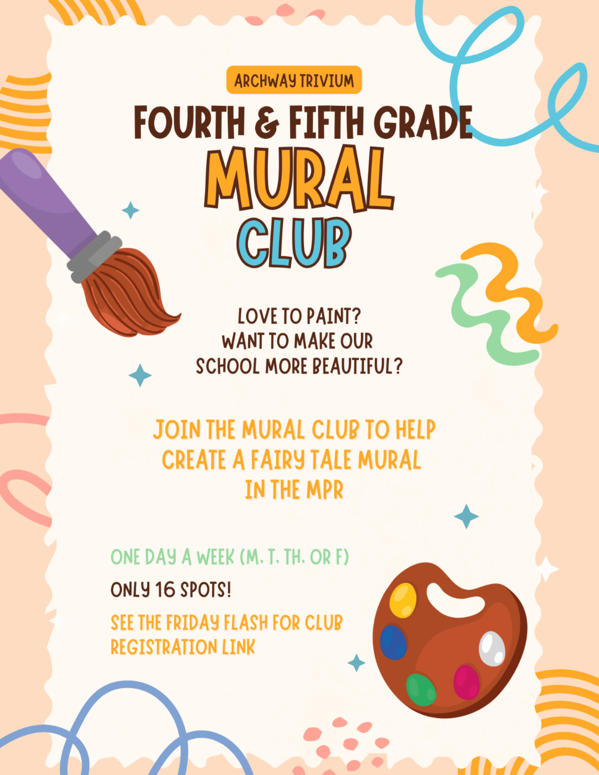 - Mural Club (4-5) - Choose one day: M, Tu, Th or Fr starting 1/23