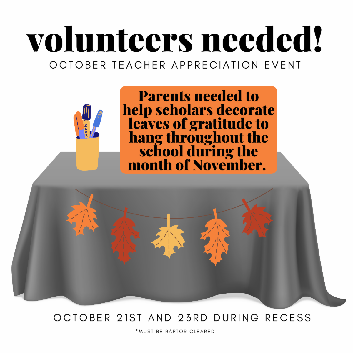 Parent volunteers are need to help scholars decorate leaves of gratitude to hang throughout the school during the month of November. If you would like to help during students' lunch-recess, please follow the link below to sign up.