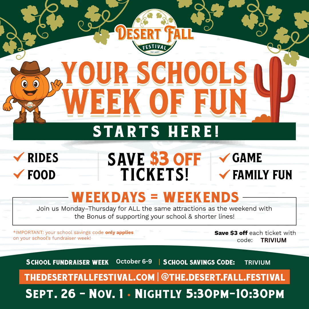 The PSO has partnered with Desert Fall Festival in Surprise, AZ during Fall Break. Purchase tickets to the event Monday-Thursday, October 6-9 using the code Trivium and you will receive $3 off/ticket and benefit our school! Please note, the school discount only applies 10/6-10/9.