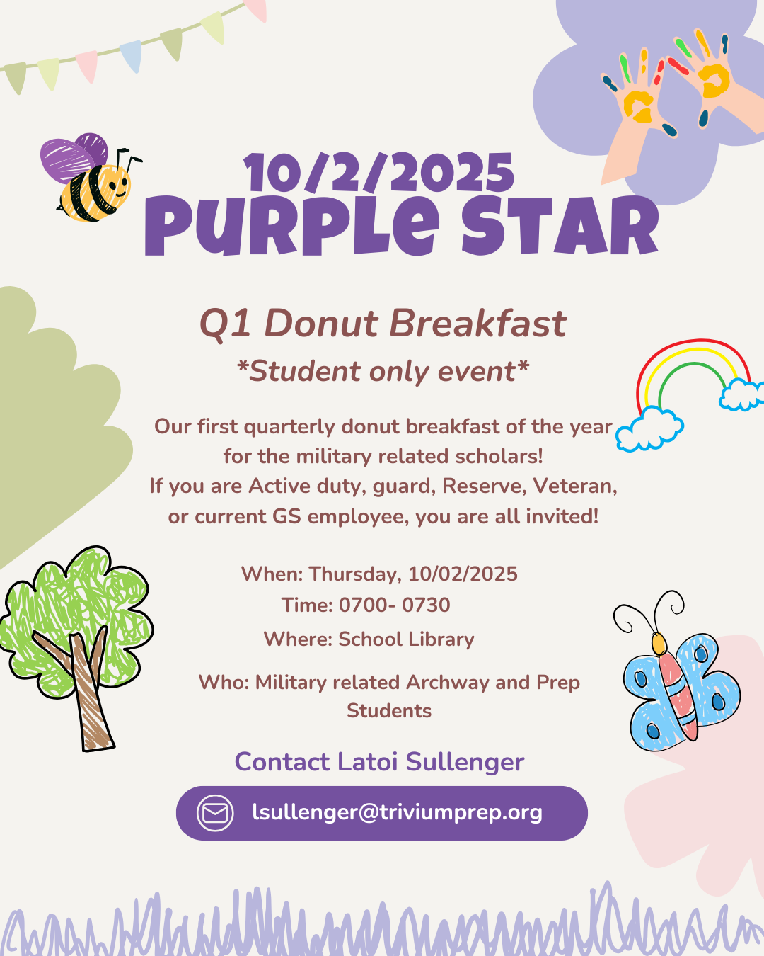 All K-12th military-related scholars are invited to join us for our Quarter 1 Purple Star student breakfast on Thursday, October 2 at 7am in the library. Archway Trivium is a part of a Purple Star School program in partnership with Luke Air Force Base. Students in families who are active duty, guard, reserve, veterans or current GS employees are welcome to attend. Please reach out to Mrs. Sullenger with any questions at lsullenger@triviumprep.org.