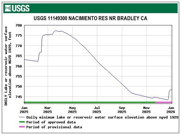 Good evening all, I hope your Christmas and New Year's were great with family and friends. Attached below is the January 1, 2026, water in/water out for Nacimiento. MCWRA has not updated lake levels since 12/23/25, but it looks like the lake came up close to 6'. Go to USGS 11149300, and you can see what NRWMAC sees. Looks like more rain is on the way. Good job on your rain dances.