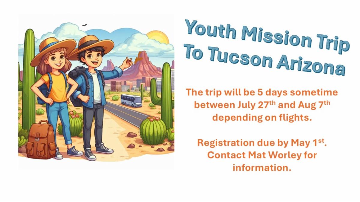 Sunday May 4th - Geranium Sale Youth Fundraiser during 10:00am Church Service. This fundraiser will help go towards the Youth Mission Trip to Arizona. Single Geraniums and Baskets are available. Contact Mat Worley for more information mat.worley@gmail.com.