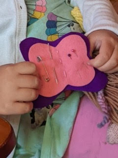 It is said that “nimble fingers make nimble minds,” and the Kindergarten children in the Daisy Blossom class have been diligently working to develop their hand-working abilities this year. Each Kindergartner is making a felt butterfly pin cushion to keep in their sewing baskets, a project we have been working on since before winter break. This is a step by step process, with each step introducing a separate handwork skill: