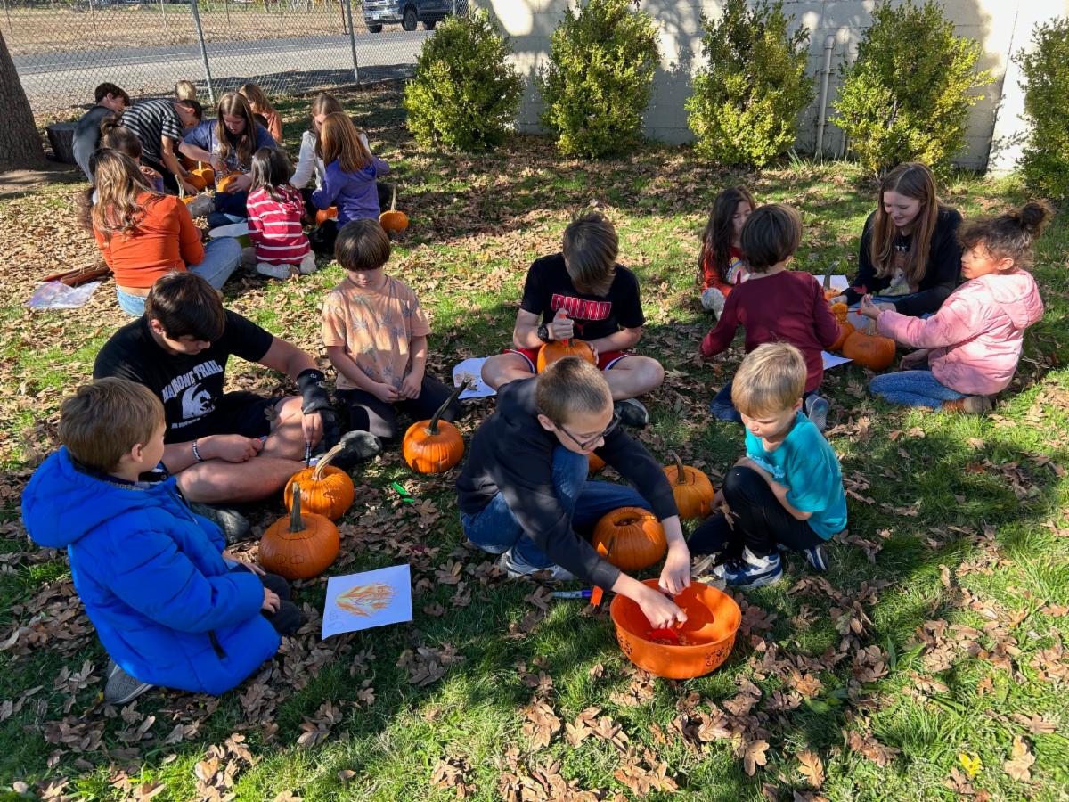 One of my favorite things about Madrone Trail, besides my getting to stay with my class for 8 years, is our system of Buddy Classes. 1st and 8th, 2nd and 7th, 3rd and 6th, and 4th and 5th grades all buddy up for the entire year. Each child is assigned a buddy from that class and the classes regularly get together to have lunch, read books, work on crafts, or go on an adventure. The adventures are the best! This year, the Ladybug and Butterfly classes have gone hiking in Lithia Park to look at the Autumn foliage, hiked in the Jacksonville woods and ate and played together at Doc Griffin Park, joined the Sunflower and Willow classes at the Pumpkin Patch (Pheasant Fields Farm), and most recently donned ice skates together in Ashland at the Darex Family Ice Rink.