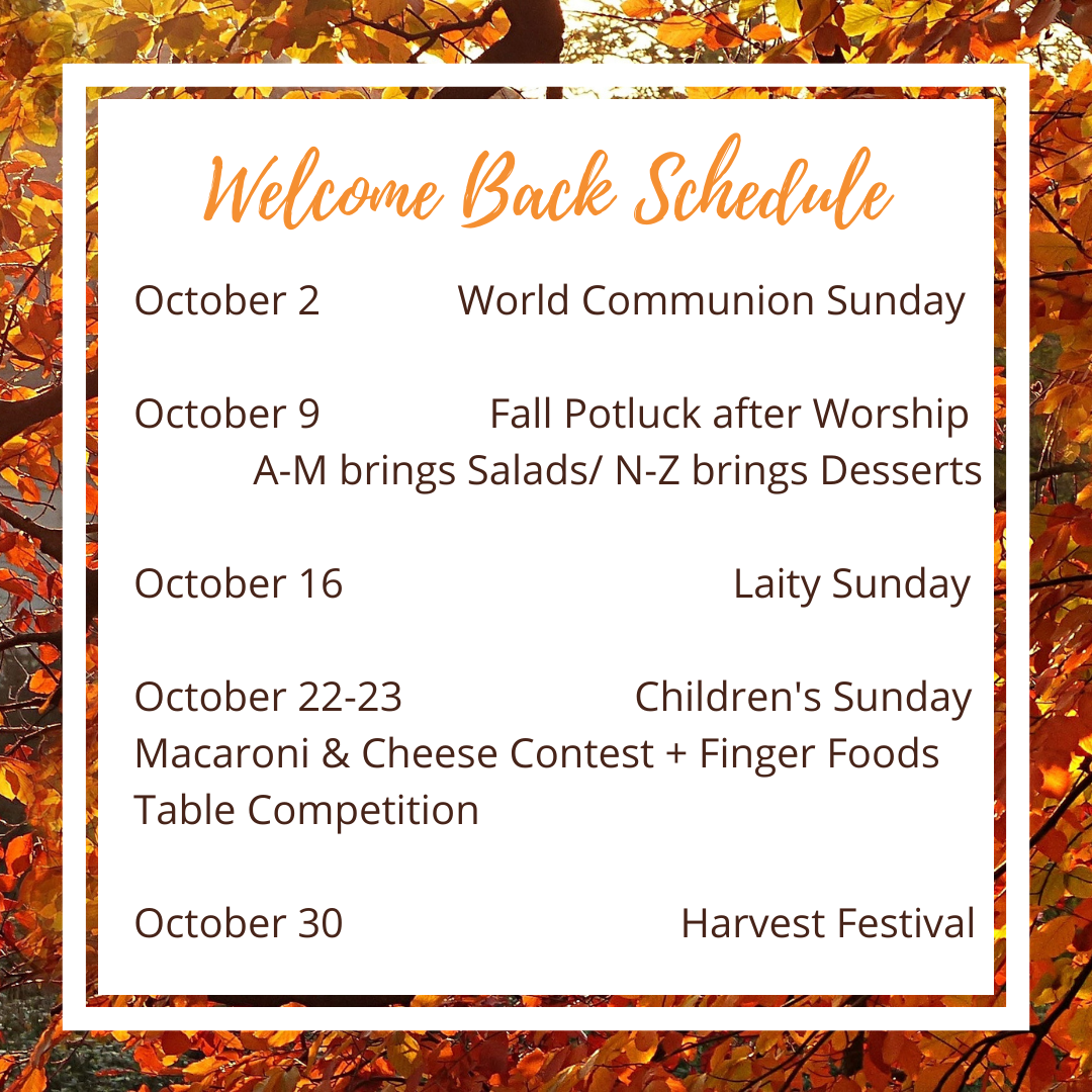 We are entering Welcome Back month at FUMC! We have something planned for each of the weekends in the month of October. COVID19 cases are finally declining and with the new vaccine update that is effective against the Omicron variant, we are returning to full activities and we want you to be a part of the renewal of our congregation. We have had several new families join us this year so we have a lot to celebrate.