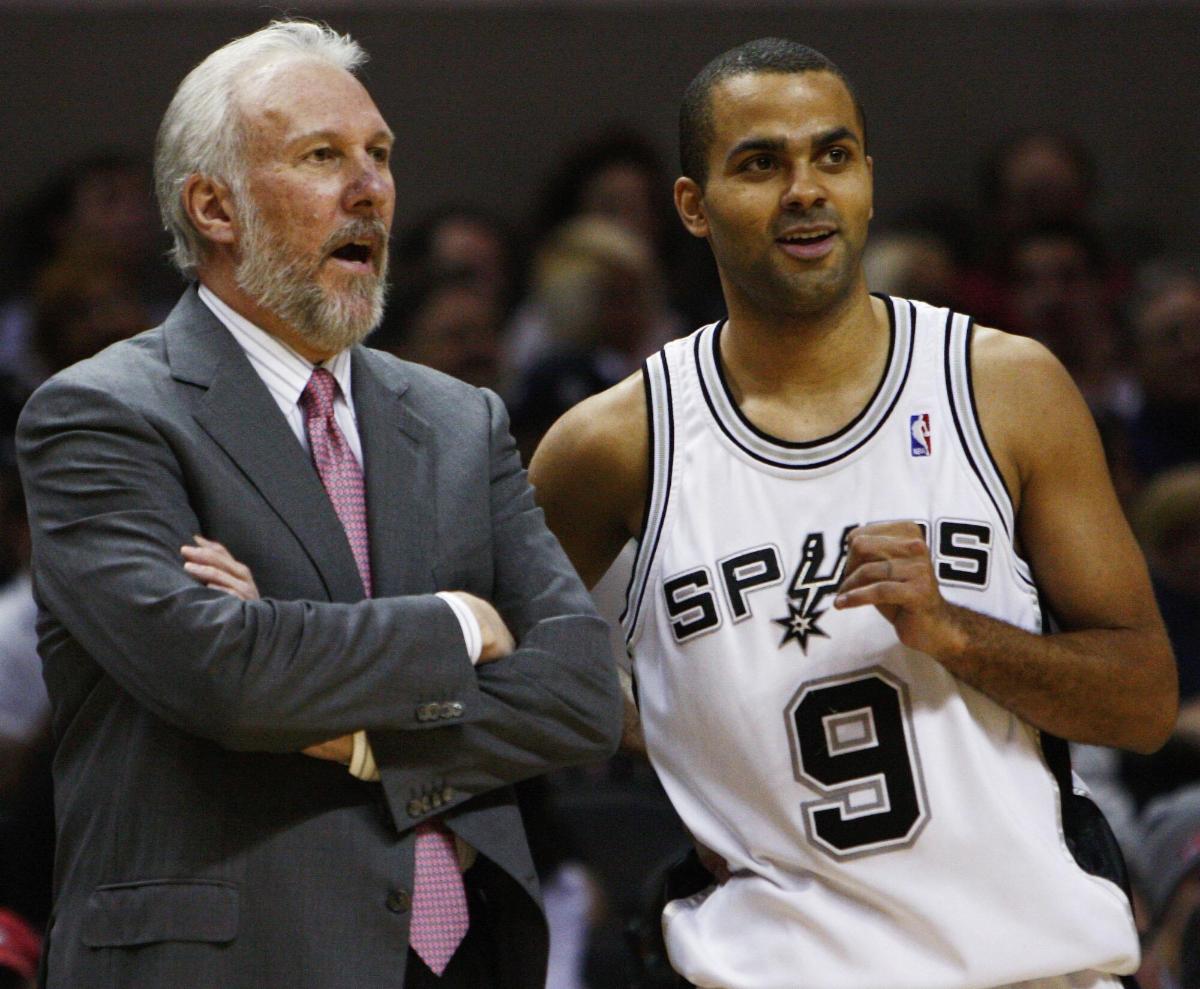 San Antonio Spurs coach Gregg Popovich with guard Tony Parker