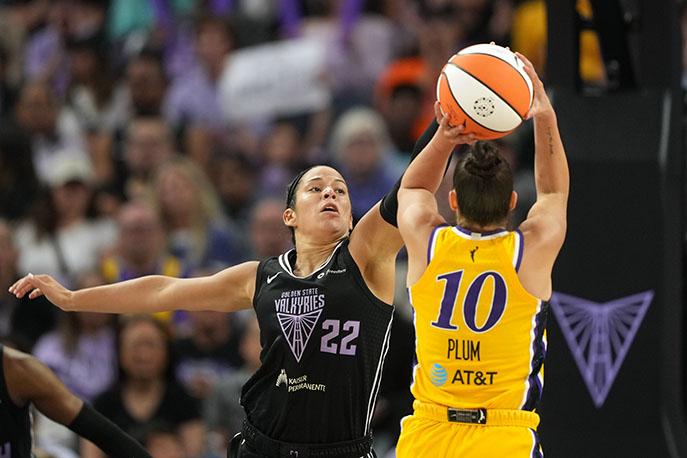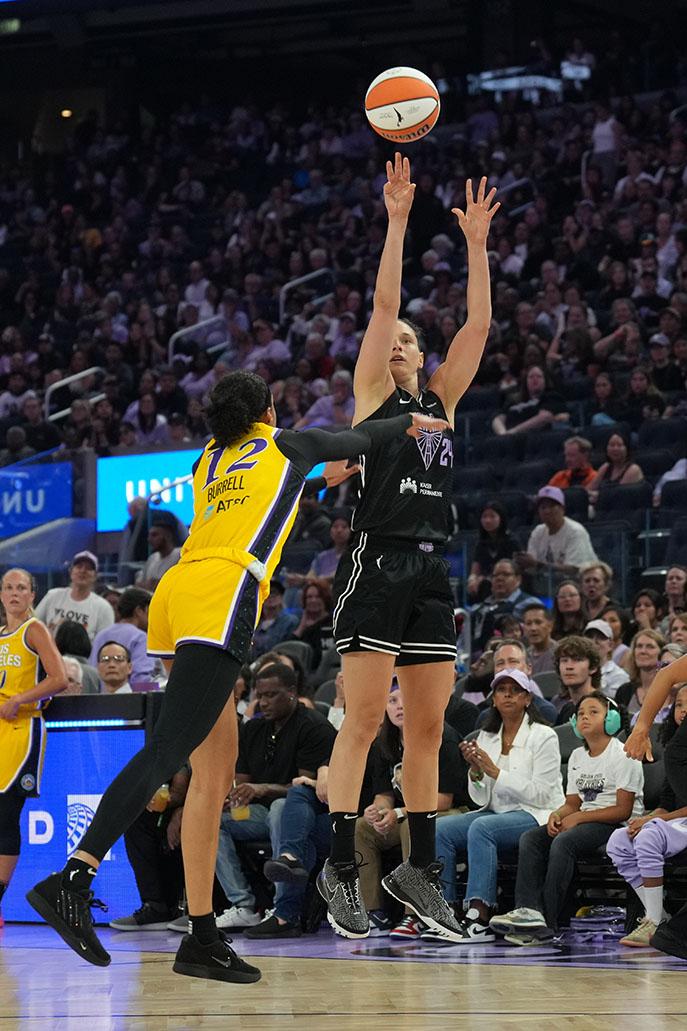 | | Burton's defense helped force Sparks superstar Kelsey Plum into a 1-for-9 shooting night. Plum is averaging 20 points a game in her first year with the Sparks. Photo and caption by Darren Yamashita. | | Former Stanford Cardinal All-American Cameron Brink returned to the Bay Area, finishing with five points and a blocked shot after recently returning from an ACL injury sustained last season. Photo and caption by Darren Yamashita. | | |