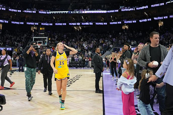 Sparks guard Julie Vanloo returned to Ballhalla for the first time after being released by the Valkyries, blowing a kiss to the cheering crowd after the game. Photo and caption