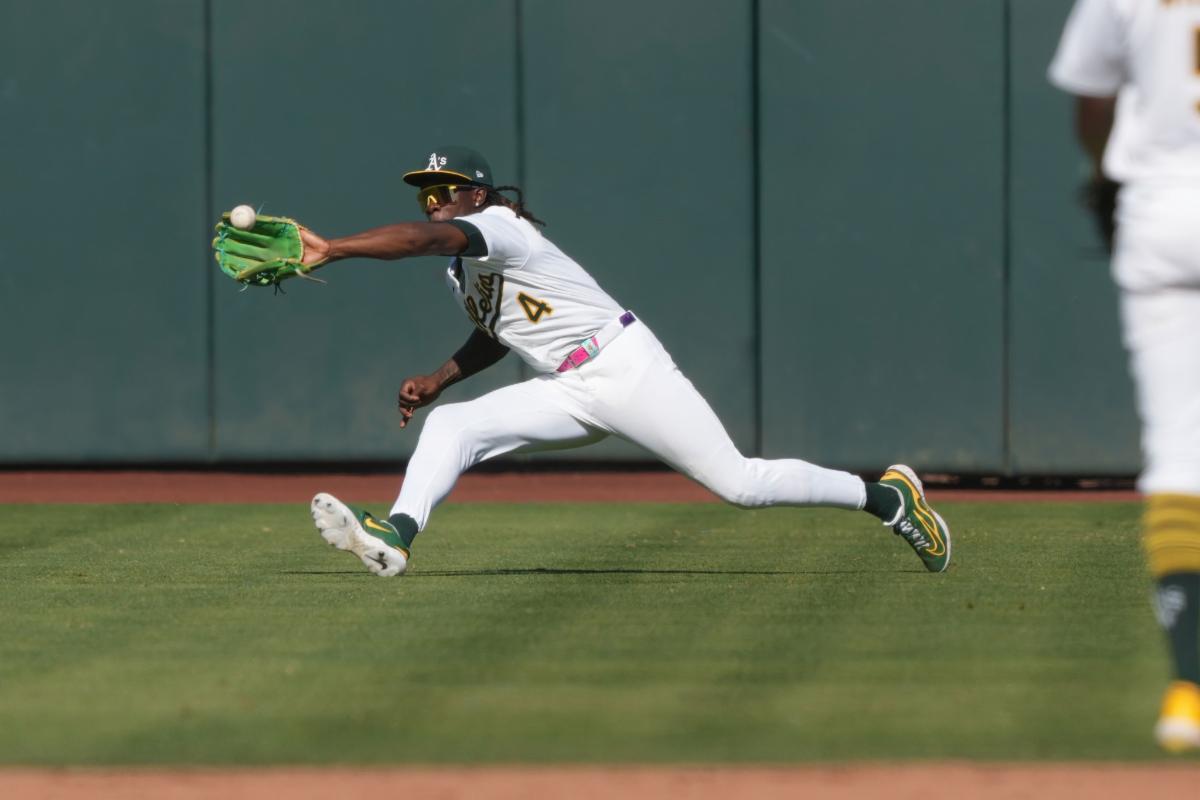 Athletics center fielder Lawrence Butler (4) catches a fly ball to end the game against the Cincinnati Reds at Sutter Health Park To view a photo album, visit our Facebook Page or www.ultimatesportsguide.net. Photo and caption