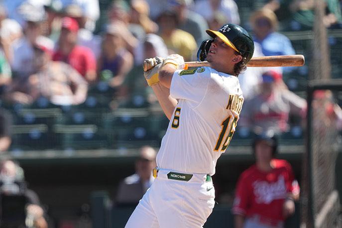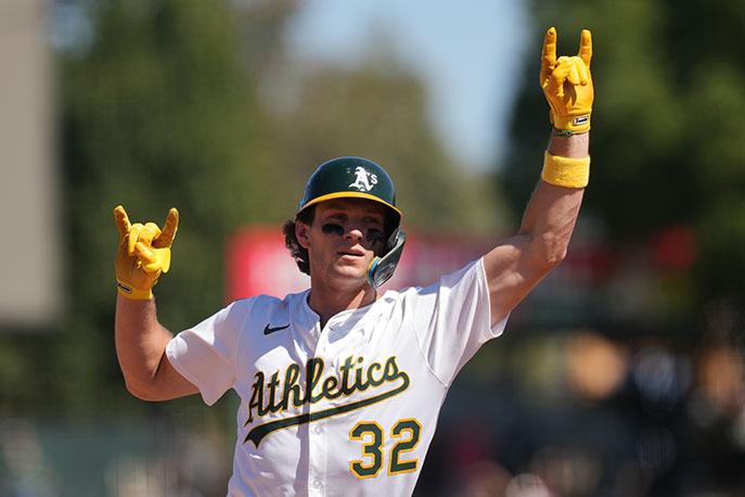 | Athletics rookie sensation Nick Kurtz hit his 32nd home run of the season as the A's completed a sweep of the Cincinnati Reds with a 7-4 victory at Sutter Health Park on Sunday, September 14th. Photo and caption by Darren Yamashita. | Starting pitcher Luis Morales went the minimum five innings to improve his record to 4-1. Photo and caption by Darren Yamashita. | Center fielder Colby Thomas gestures while rounding the bases after hitting a home run in the fourth inning, part of a 3-for-4 day at the plate. Photo and caption by Darren Yamashita. | |
