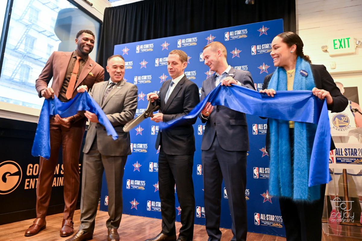 Ribbon cutting at the Warriors pop up location at the NBA All-Star Alley are Festus Ezeli, Mark Tatum, Mayor Daniel Lurie, Brandon Schneider and Marisa Rodriguez, CEO Union Square Alliance. Caption and photo by Ed Jay. | |