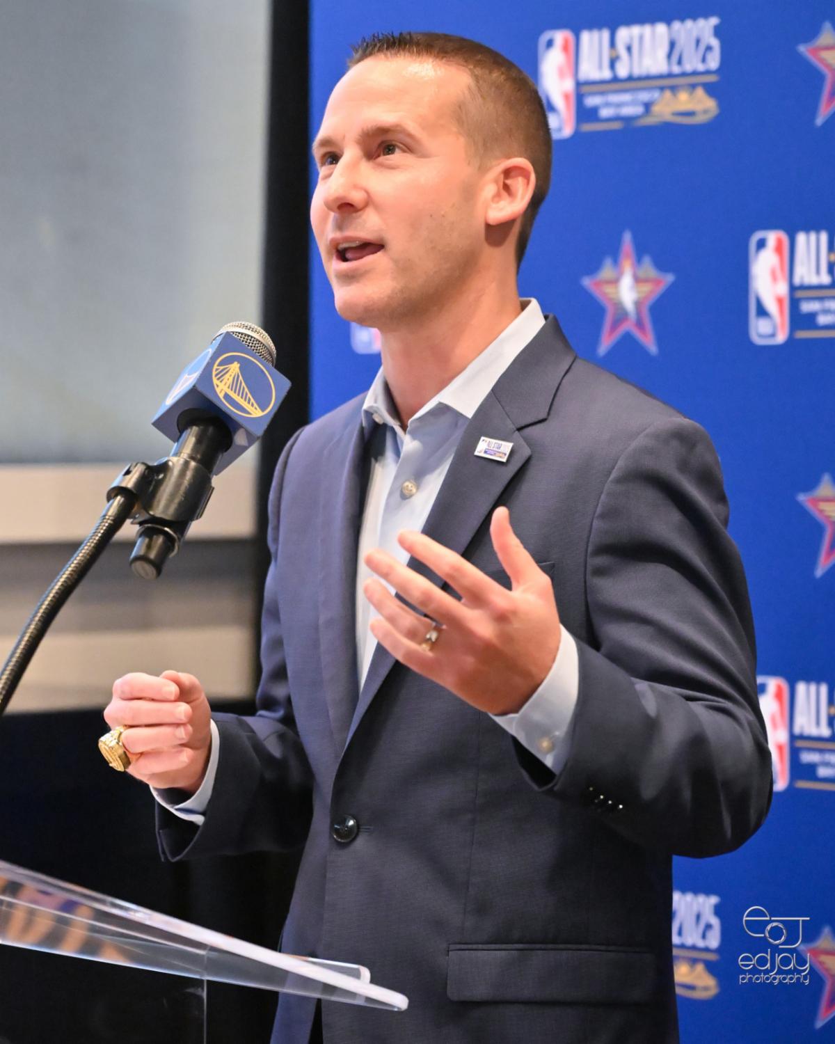 Mark Tatum, Deputy Commissioner and COO of the NBA, addresses the media and guests at the kickoff to the All-Star Game at the Bay Area Host Committee event. The Committee will maximize the planning and coordination of the various Bay Area regions as they prepare for the NBA All-Star Game, The Super Bowl and FIFA World Cup in 2026. Caption and photo by Ed Jay. | |
