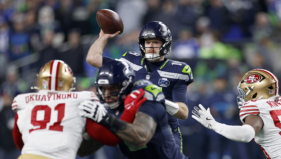 Seattle quarterback Sam Darnold certainly wasn’t brilliant, but he didn’t have to be as he kept handing the ball off to running back Kenneth Walker who bludgeoned the 49ers for 116 yards and three TDs, while wily veteran receiver Cooper Kupp reminded many of his recent Pro Bowl caliber performances with five catches, three of those coming on key third down plays.