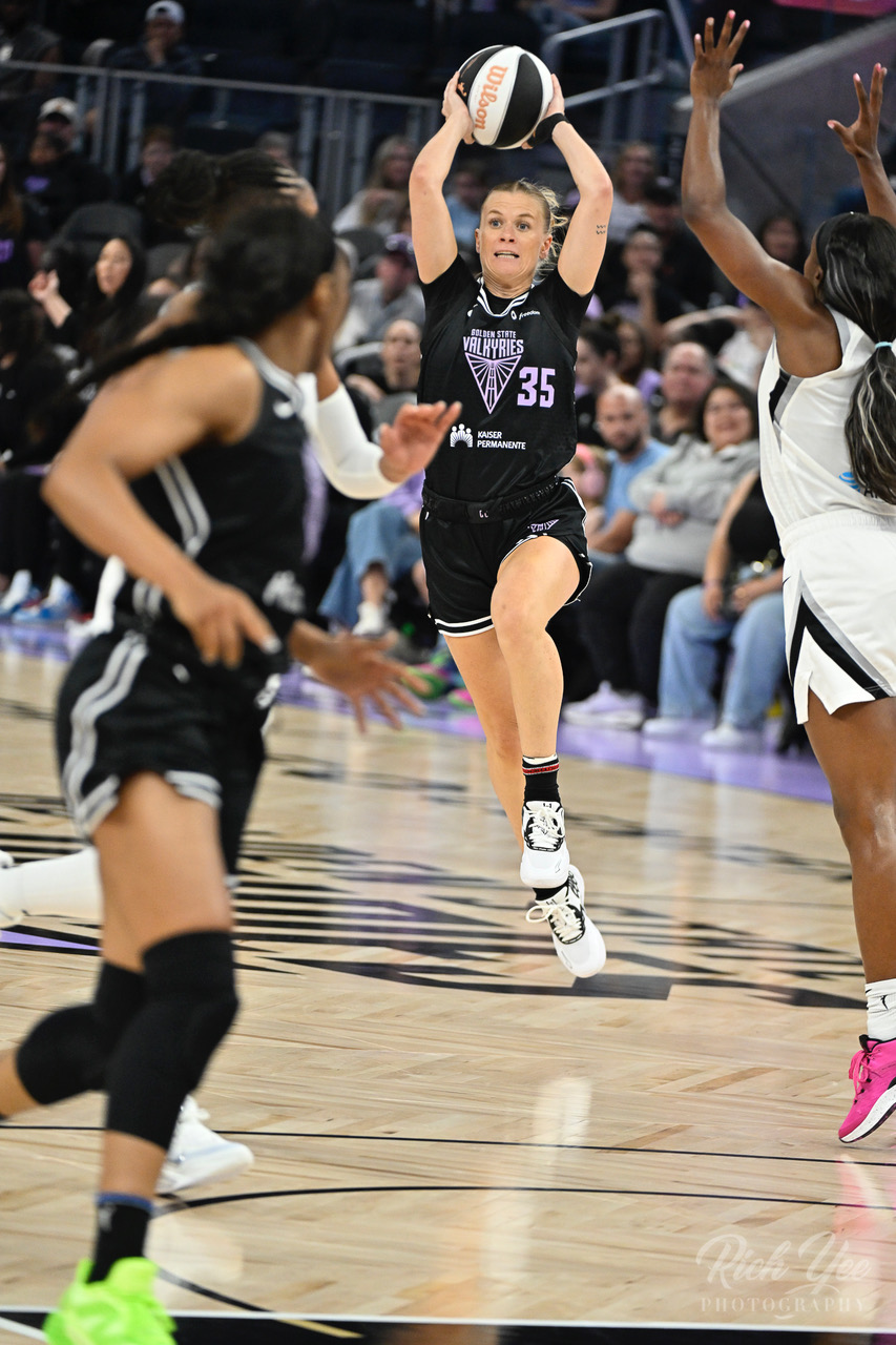 Golden State Valkyries Julie Vanloo (#35) passes to a teammate as the Valkyries defeated the Las Vegas Aces, 95-68, on Saturday afternoon, June 7 at Chase Center in San Francisco, CA.
