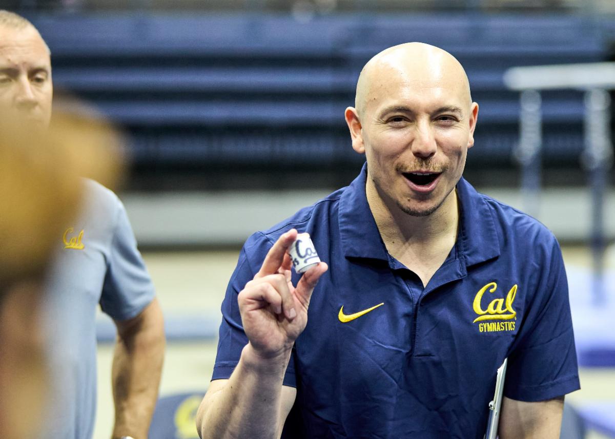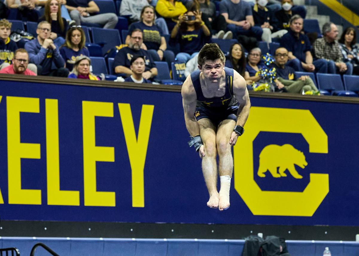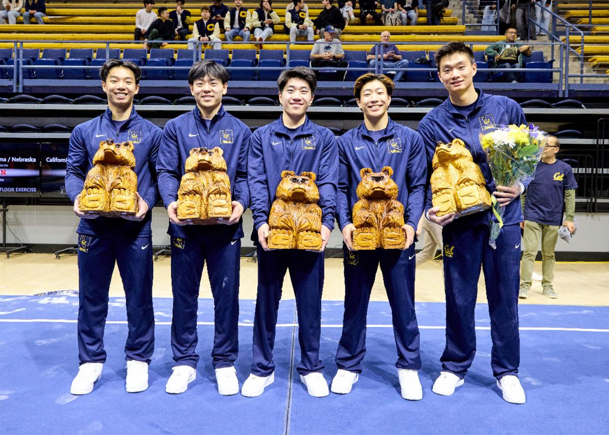 Friday night was a special night in many ways for the Cal men’s gymnastics team as there was competition with the nationally ranked Oklahoma Sooners and Nebraska Cornhuskers. Plus there was Senior Night, celebrating five athletes, and finally, the final send off for outgoing head coach JT Okada. Before the action, Cal honored seniors (L-R) Landon Wu, brothers Sean and Tyler Shimizu, graduate student Tomo Kawada, and fifth year student Aidan Li, with the now customary carved wooden bear sculptures. Caption and photo by Ron Sellers. | |