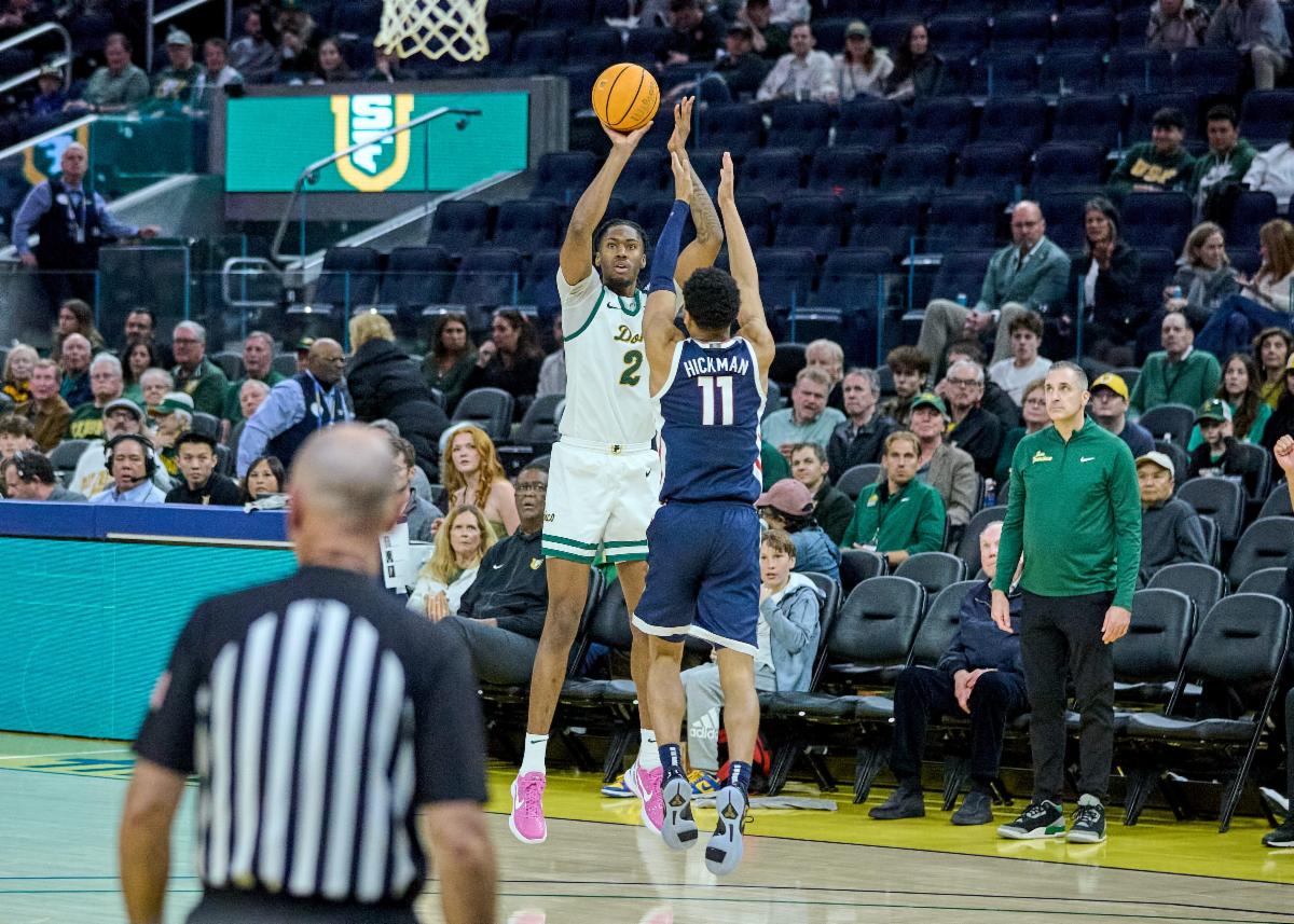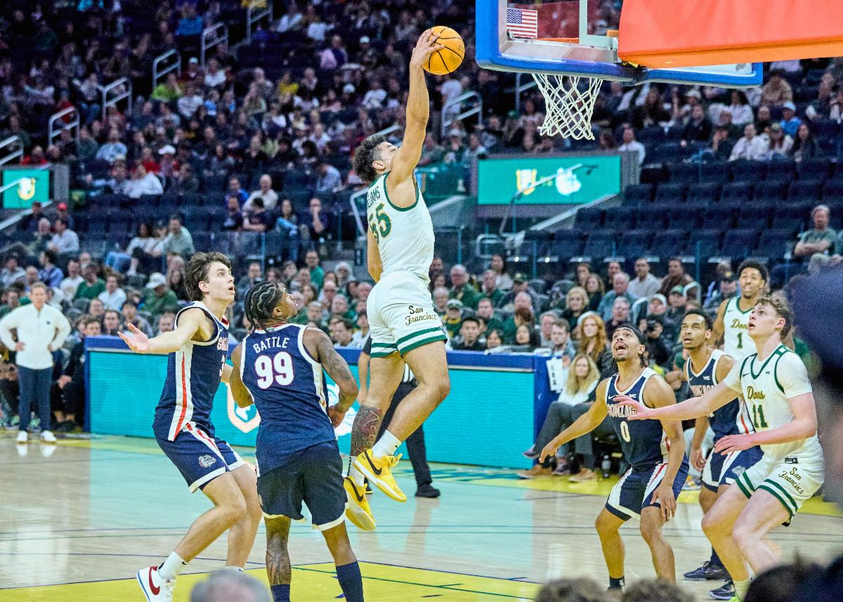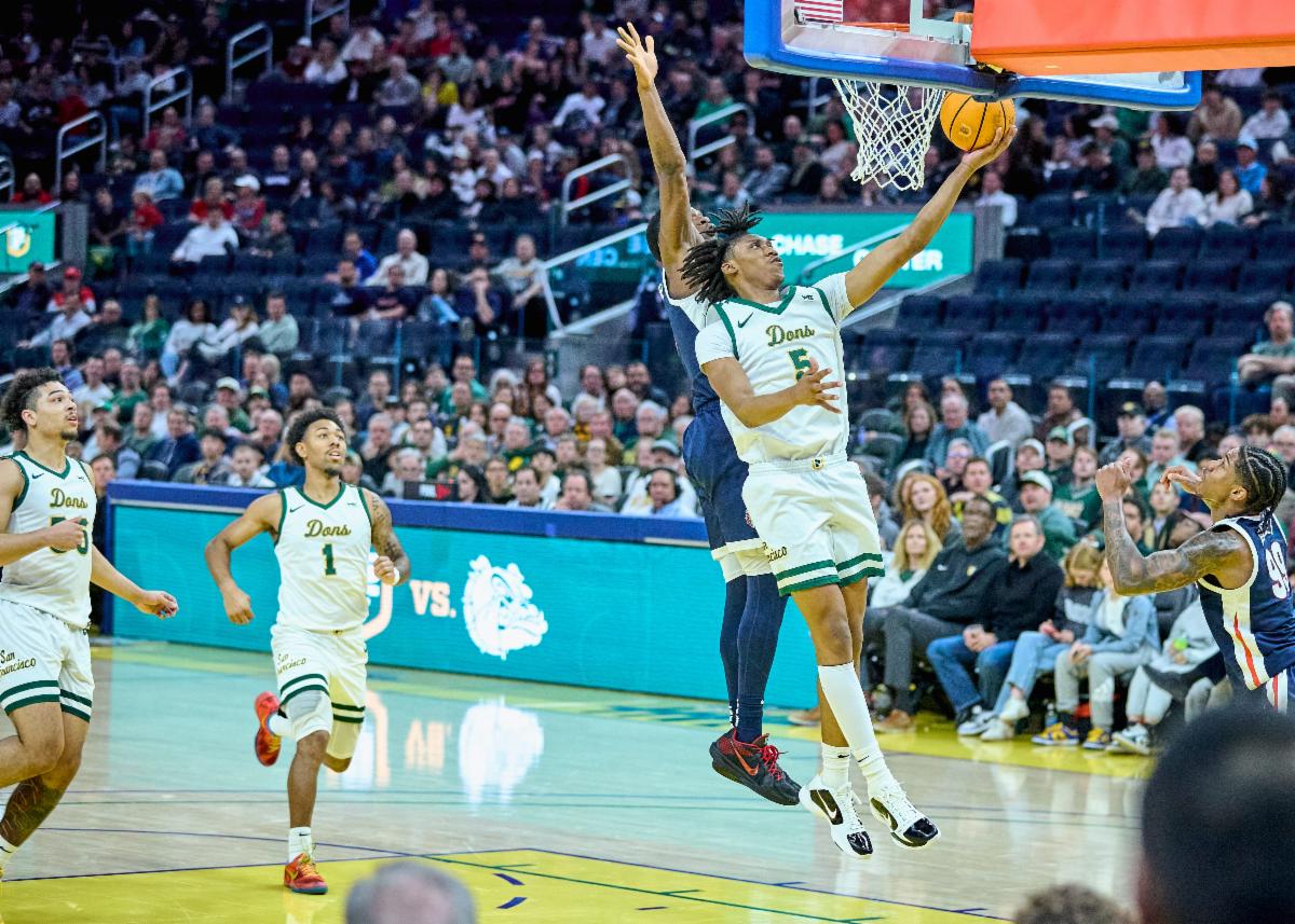 With their post season on the line, the Dons from USF faced off against the Bulldogs from Gonzaga in the final regular season game in WCC conference with the winner getting the second seed in the conference championships and a bye until the semifinals. Under heavy mist outdoors, it was the friendly confines of the Chase Center in San Francisco with 6,300 in attendance who would watch USF fall behind early with cold shooting. The Dons would fight to get close, but Gonzaga would eventually pull away and take the win, 95-75. Above: coming in off the bench, Ryan Beasley (#0) puts up a three-point attempt early in the first half, but would leave the game before halftime with an ankle injury.